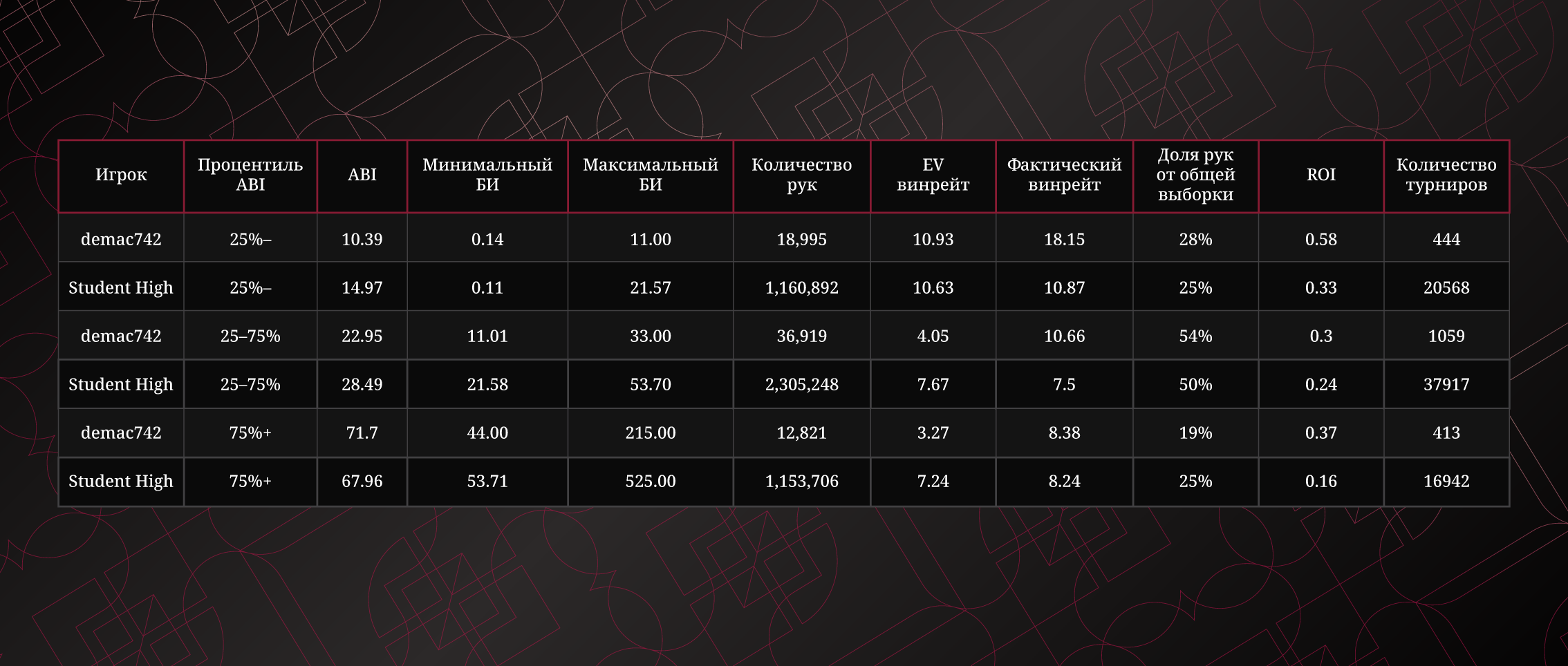 Мы также делаем разбивку по бай-инам. Бывает, что игрок стабильно показывает хорошие результаты в дешевых турнирах, а в средних и дорогих – уже нет. Его винрейт там в 3-4 раза ниже. Это критично: если человек не бьет лимиты выше, он быстро выйдет в ноль.